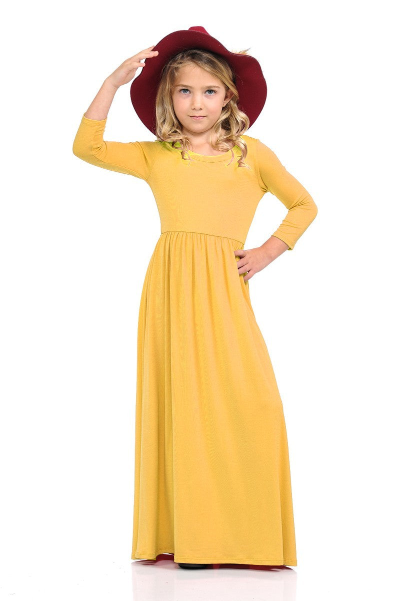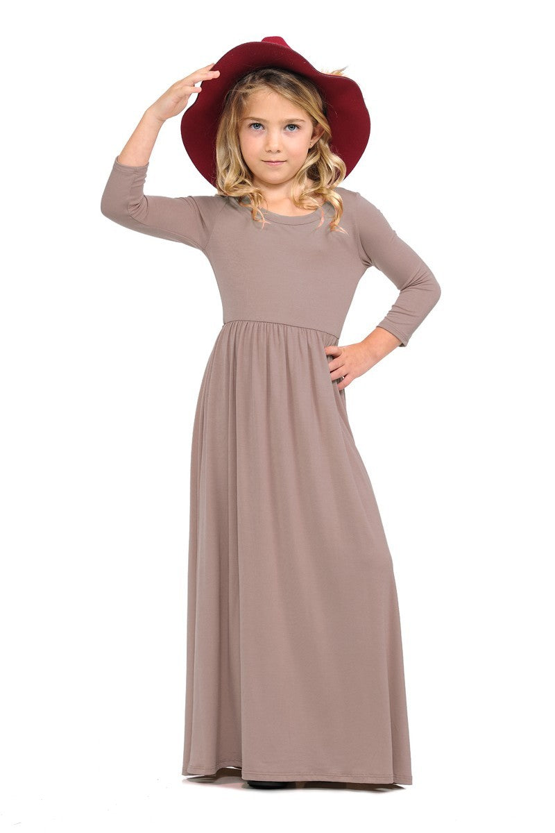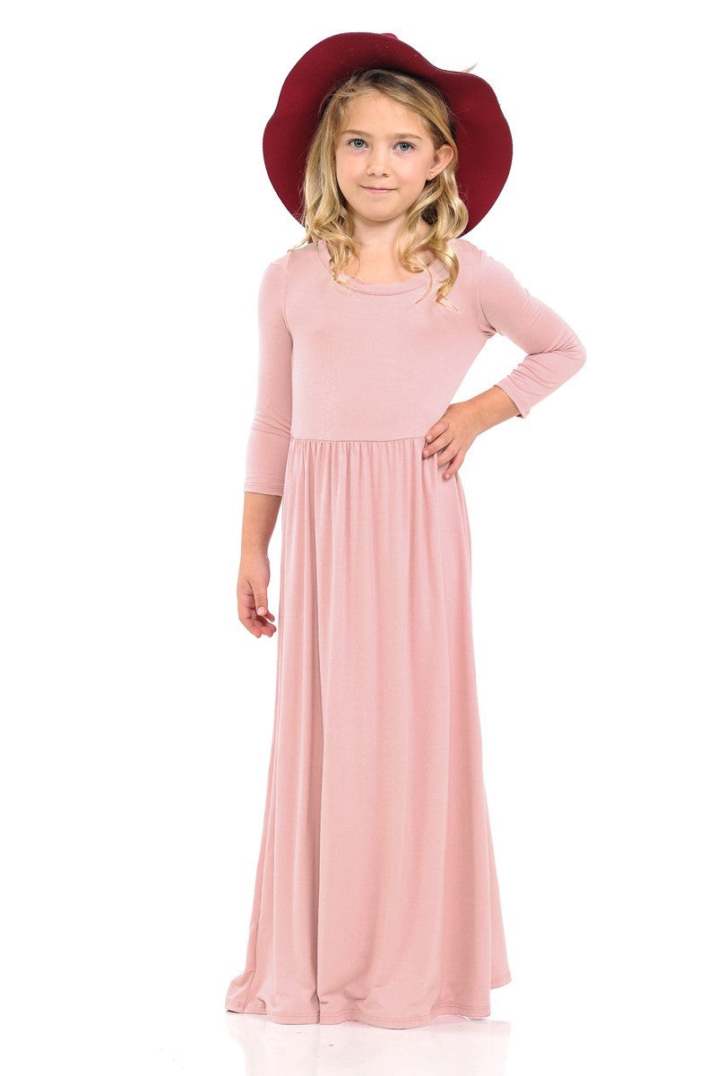 Shop the Girls Maxi Dress with long sleeves. This stylish dress features a solid color, three-quarter sleeves, and a comfortable fit for ages 5-12.