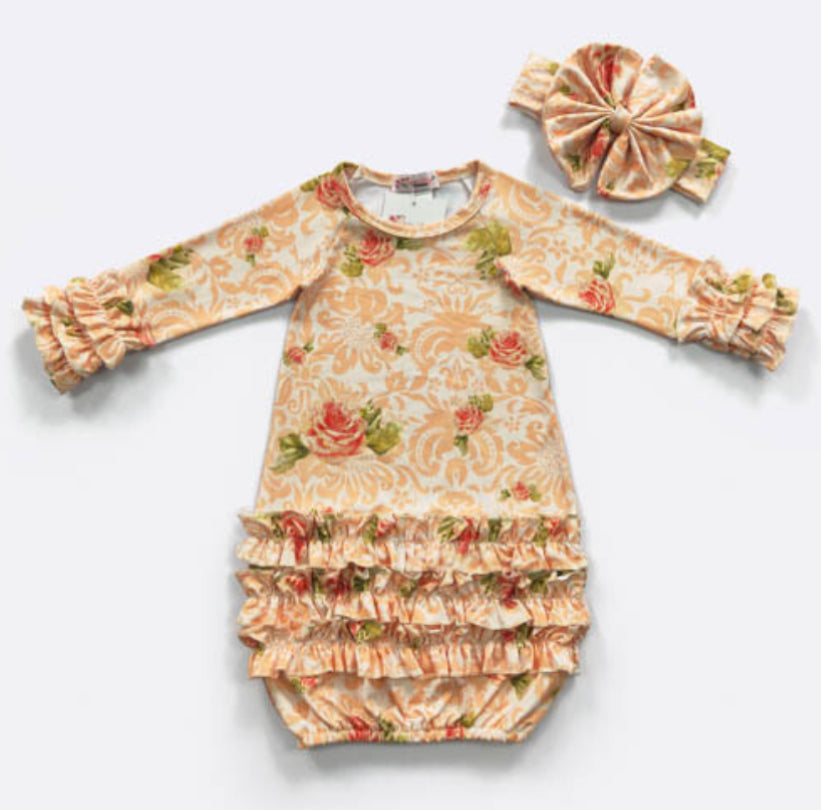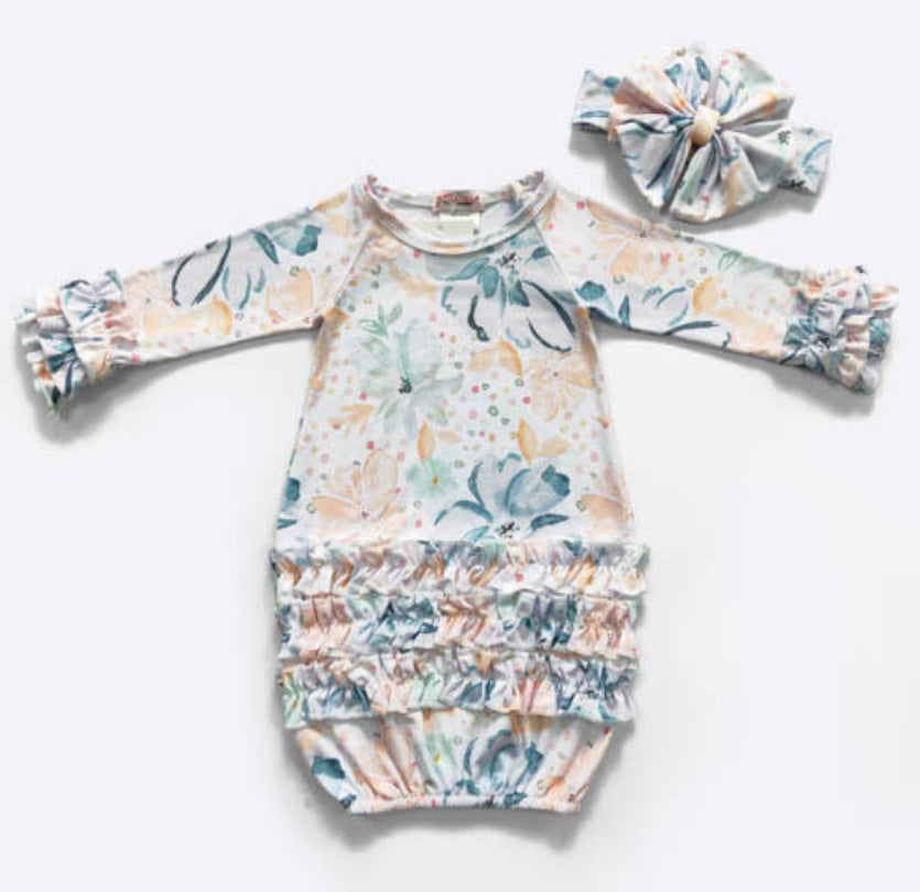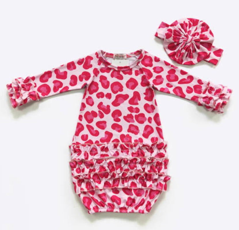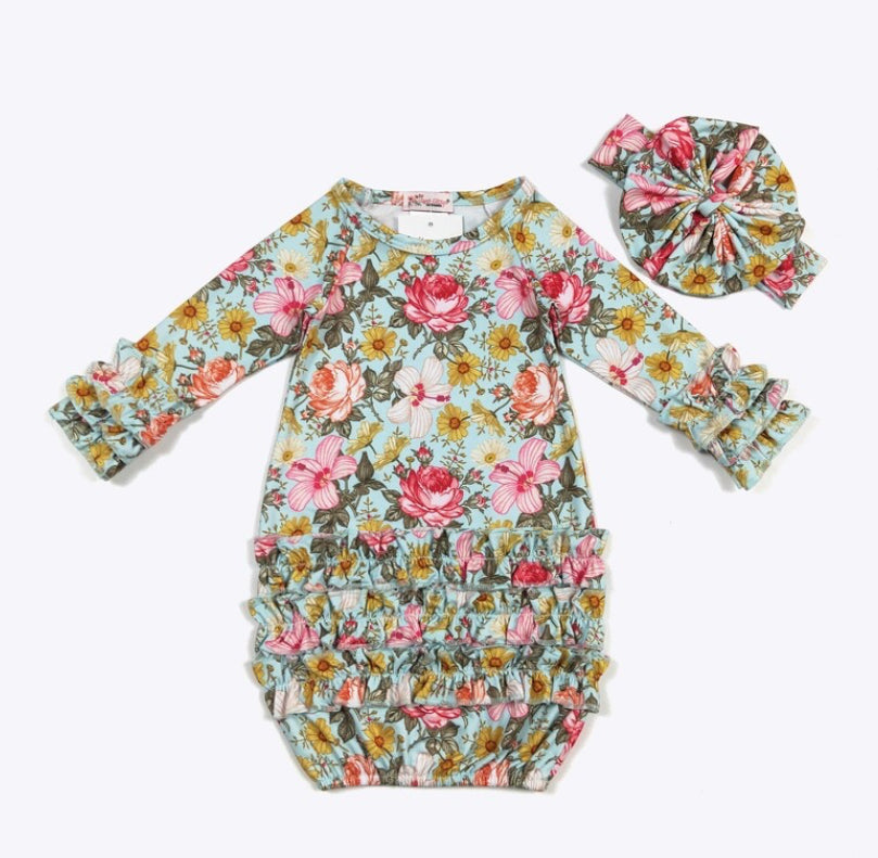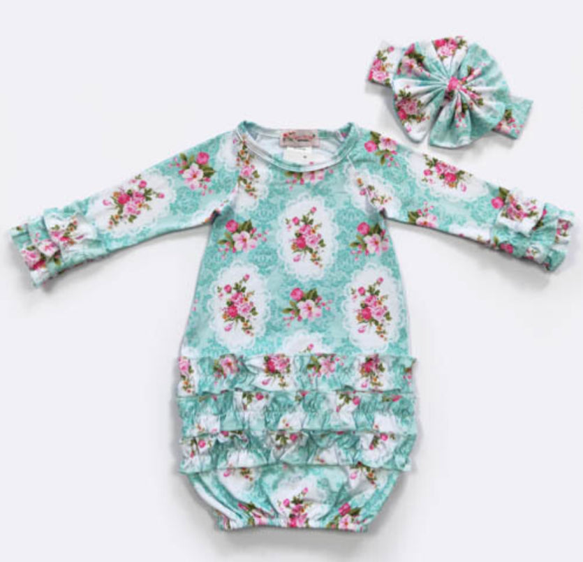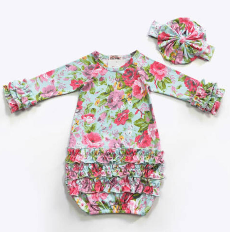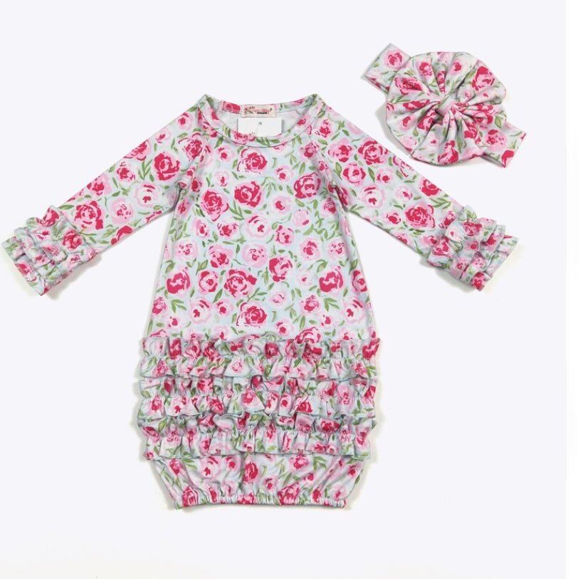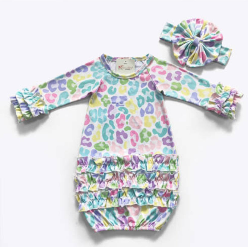 Experience sweet dreams and playtime fun with our Newborn Baby Girl Gown and matching Headband set. This cozy and soft poly blend set is perfect for little ones aged 0-3 months. Measuring 17 inches in length and 8 inches wide at the chest, your precious baby will be comfortable and stylish. Many assorted prints available. Photos reflect actual print.